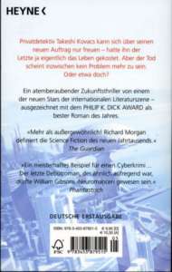 Die Filmrechte hat Morgan bereits verkauft, der zweite Roman um Takeshi Kovacs, Broken Angels, ist in englischer Sprache erhältlich, und sein neuster Roman Market Forces erscheint unter dem deutschen Titel Profit.